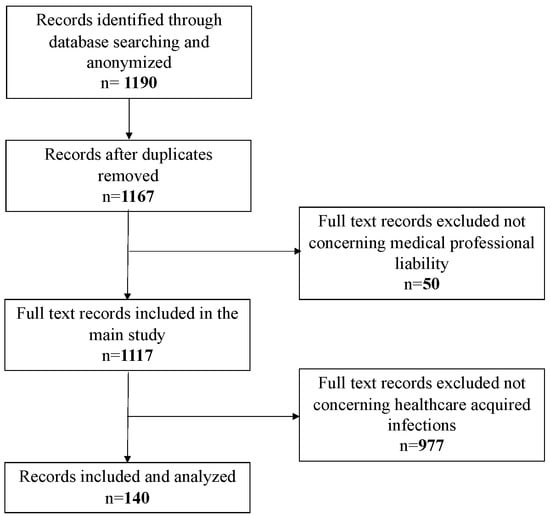 The second step involved the analysis of 1117 documents exclusively relating to medical malpractice cases. For the analysis, a work grid was used to process the data, using the EXCEL program (Office 365), to systematize the data mining. The grid was also set up with some locked fields, to minimize the inter-individual variability between the three auditors. The items present in the columns of the excel grid were: judgment no., occurrence year, publication year of the judgment, medical specialty involved, type of negligence/liability sued and recognized, type of damage (injury/death), type of parties involved (public/private facility or single healthcare worker), outcome of the trial, and compensation paid. At the end of this step, 140 judgments concerning medical liability cases with underlying healthcare services–related infections (Figure 1) were investigated. The latter were further analyzed in order to detect both the type of microorganisms involved and the related infection, when expressly mentioned in the judgment.