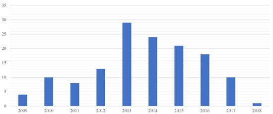 In the five-year study, 140 compensation claims referred to healthcare-acquired infections damage (that is 12.5% of the total of judgments in the medical professional liability field issued by the court over the period in question). The judgments analyzed (issued during the five-year reference period 2016–2020) concerned lawsuits introduced in the period from 2009 to 2018, most of which were introduced in 2013–2014 (Figure 2).