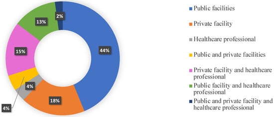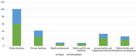 Sixty cases involving only public health facilities showed that they were recognized liable and sentenced to award compensation in 68.3% of cases; in private facilities, sentences were issued in 64% of cases. On the other hand, the conviction rate rose to 57.1% in cases involving both healthcare professionals and private facilities, to drop to 52.9% in those cases in which only the healthcare provider and one or more public facilities were sued (Figure 4).