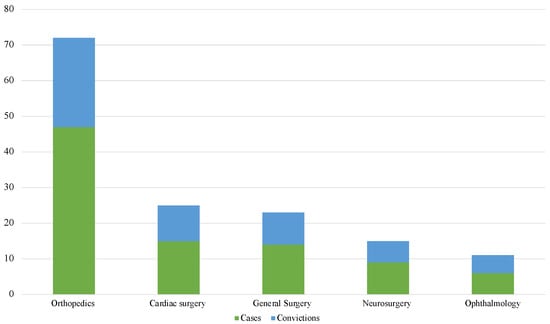 The most involved branches were those related to the surgical areas (Figure 5). Orthopedics were involved in 47 of the 140 (33.6%) cases, followed by heart surgery with 15 out of 140 (10.7%) cases, and general surgery with 14 out of 140 (10%) litigations. With regard to the data related to the risk of conviction diversified by branch, sentences resulted in 25 out of 47 (53.2%) of orthopedics cases, in 10 out of 15 (66.6%) of cardiac surgery cases, and in 9 of 14 (64.3%) of those relating to general surgery. Particularly interesting is the data relating to ophthalmology, representing 6 out of 140 (4.3%) cases, with a litigation/conviction ratio of 83.3%.