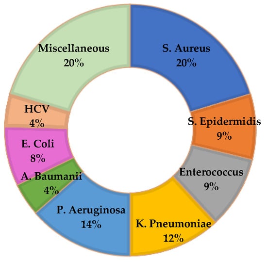 With regard to the most involved microorganisms, although trends vary according to the different national realities (and over years), it has been shown that bacteria belonging to the Enterobacteriaceae family, such as Acinetobacter Baumanii and Pseudomonas Aeruginosa, are currently the most commonly isolated, while among Gram-positive bacteria, Staphylococci, especially Methicillin-resistant Staphylococcus aureus (MRSA) and Enterococci are the bacteria detected in the highest numbers [,].