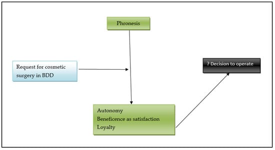 Practical wisdom, or phronesis in the Aristotelian concept, represents the path that ensures the right means to human wellbeing [19]. According to Kaldjian, wise clinical reasoning involves goals, concrete circumstances, virtues, deliberation, and motivation to act [20]. In the particular case of BDD, the concrete circumstances are the patient’s current pathological self-perception and are questionable, affecting the surgeon’s motivation to act.