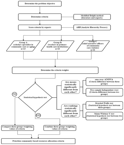 In the third round, the study recruited 34 experts from different fields to explore their approaches to prioritization. These experts were divided into three groups: (1) Group A: scholars specializing in community care or aging, such as professors in universities; (2) Group B: medical workers in primary healthcare institutions, such as registered professional nurses, physical therapists, speech therapists, and occupational therapists; (3) Group C: chief executive officers of community care stations, such as presidents and chiefs of staff. The experts in groups B and C were specialists in community care practice. To qualify the profession of these experts, this study invites experts based on the official government award roll “‘2022 Taiwan Community Care Golden Stations Award” [8]. Before determining the weights of the criteria, statistical hypothesis tests were performed to evaluate whether the weights of the three expert groups were statistically significantly different from each other. Finally, the weights were classified to prioritize community-based resource allocation criteria. The procedures are schematized in the research framework in Figure 1.