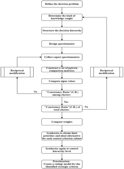 Through quantitative techniques under AHP, complex problems can be systematically decomposed at different levels. The problem-solving steps using AHP are as follows (see Figure 2): (1) Describe the problem, identify the influencing factors, and establish a hierarchy, which could be described as “modeling”. (2) Using pairwise comparison and proportional scales, find the relative importance of the decision-making attributes at each level. Rate the criteria and calculate the relative weights among them or alternatives against different criteria. (3) Establish a pairwise comparison matrix, calculate its eigenvalues and eigenvectors, and obtain the weight of each attribute that is obtained. Use the consistency ratio (CR) to estimate the homogeneity of the judgments and the sensitivity analysis. A CR of less than or equal to 0.1 means that the expert’s opinion passed the consistency index test. Otherwise, continue with the “reciprocal modification” to confirm the logical consistency of the expert to achieve reliability.