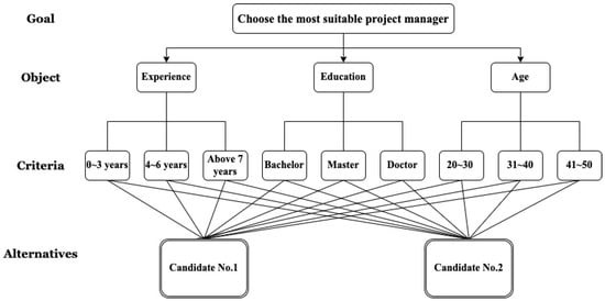 The AHP method, developed by Saaty [59], is a measurement theory that adopts pairwise comparisons and relies on experts’ judgments to derive priority scales. It has been used for decision-making processes in different fields and has been adopted mainly in the discussion of decision-making problems under uncertainty and with multiple evaluation criteria. The strengths of this method include the simultaneous consideration of general attitudes and the detailed analysis in problem solving and the ability to account for the opinions of different experts. Since decisions may be inconsistent, the AHP method addresses measurement inconsistencies and improves judgments to the best possible extent to achieve better coherence [60]. The derivative priority scale is synthesized by adding the priority of the parent node to the parent node.