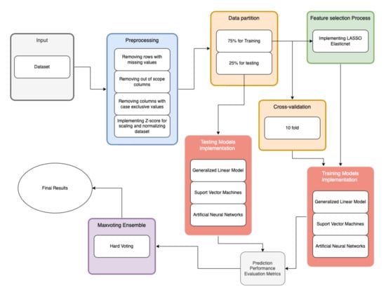 The 3 models implemented for the ensemble are: Generalized Linear Model (GLM), Support Vector Machines (SVM) and Artificial Neural Networks (ANN) as shown in this research performed by Kavakiotis I. et al. []. These models were selected because they are well known for making accurate predictions in classification problems and broadly used in clinical data processing; all of these models used the product features of the LASSO implementation.
