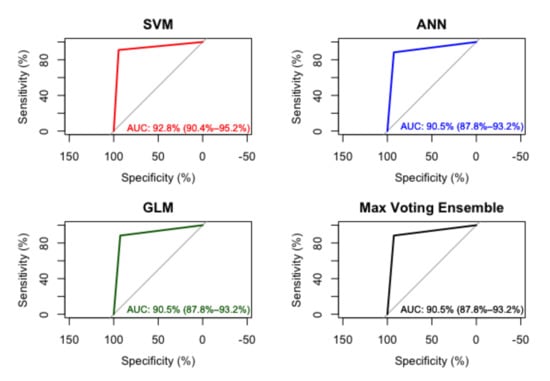 The ensemble model showed an AUC similar to the ANN and GLM models with the 90.5% as average, with the SVM model being 2.3% better than the other models in this case, as shown in Figure 3.