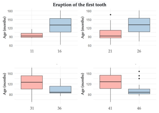 The most frequently erupting first tooth in the upper arch was the first permanent molar, while in the lower arch it was the central incisor [2,8,9,10,11,17,24,36], which differs from other studies [3,14,25,37]. There was a statistically significant relationship between the eruption of the first tooth in the different hemi-arches. This could be due to a functional factor. The chewing in a large number of patients is altered, which explains why there is an increase in the reception of chewing loads in the anterior sector. The lower dental group has a smaller coronal and root dimensions compared to the upper teeth; therefore, eruption begins earlier in the lower arch.