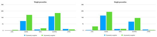 Figure 2 shows the means regarding the relationship between these eruptions’ symmetric eruption and asymmetric eruption, taking into account the different weight and height percentiles.