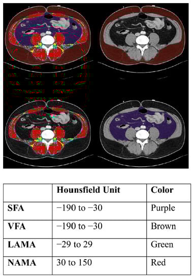 Segmental abdominal body fat and muscle analysis at the L3 vertebra on abdominopelvic computed tomography. SFA, subcutaneous fat area; VRA, visceral fat area; LAMA, low-attenuated abdominal muscle area; NAMA, normal-attenuated muscle area.