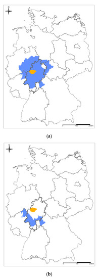 (a) Map of the Federal Republic of Germany. University Hospital Marburg is located in the district of Marburg–Biedenkopf (orange), which is part of the German federal state of Hesse (bold black). The contiguous part of the hospital’s catchment area for neurotrauma patients admitted between 1 January 2018 and 31 December 2021 (blue) extends into the neighboring federal states of (clockwise, beginning in the north) Lower Saxony, Thuringia, Bavaria, Rhineland–Palatinate, and North Rhine–Westphalia. (b) The southwestern margin (SWM; blue) of the hospital’s contiguous neurotrauma catchment area extends to the densely populated Frankfurt Rhine–-Main metropolitan region, part of which belongs to the German federal state of Hesse (bold black).