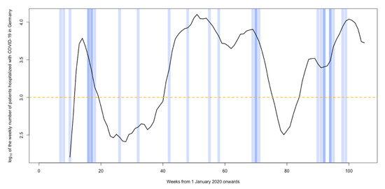 We retrieved weekly numbers of patients hospitalized with a COVID-19 infection in Germany (PHCG), as of March 2020, online at the website of the Robert Koch Institute (RKI, [11]). Calendar weeks with >1000 PHCG, i.e., from 16 March 2020 to 10 May 2020 (weeks 12–19, 2020); from 24 August 2020 to 6 June 2021 (week 41, 2020–week 22, 2021); and from 2 August 2021 to 31 December 2021 (weeks 31–52, 2021), were defined as high COVID-19 caseload weeks (HCLW, Figure 2).