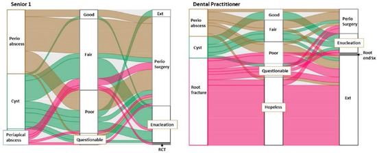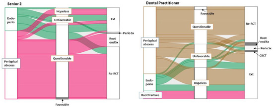 Based on the alluvia diagrams, assigning a prognosis appears to be a more difficult task than making a diagnosis. Prognosis in healthcare fields commonly refers to the expected course of a disease or a condition and should be determined before formulating treatment plans [18]. The reason why DPs assigned a poorer prognosis than senior students and recommended more extraction warrants further study.