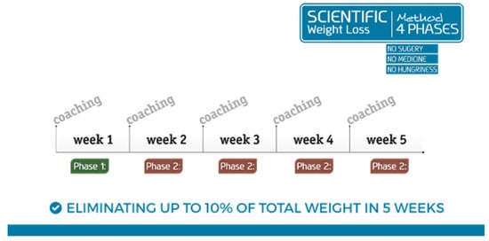 In Phase 1, detoxication occurs due to reducing total carbohydrate intake to 40 g/day (including fibers) for 1 week. After this week, Phase 2 will begin, and rapid weight loss lasting 4 weeks is expected (Figure 1). After reaching the weight loss goal, individuals will then follow Phase 3 for a duration of 4 weeks, where food groups with higher amounts of carbohydrates are reintroduced, and then Phase 4, where the focus is on nutritional education and weight maintenance for 16 weeks, in order for individuals to learn how to eat and how to not regain the weight that has already been lost.