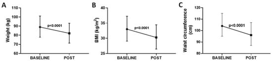 Representation of variation in weight (kg, (A)), BMI (kg/m2, (B)), and waist circumference (cm, (C)), presented as the mean and SD, of all the volunteers enrolled in the present study, both before (BASELINE) and after (POST) 4 Phases Methodology application.