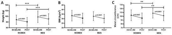 Representation of variation in weight (kg, (A)), BMI (kg/m2, (B)), and waist circumference (cm, (C)), presented as the mean and SD, of the volunteers enrolled in the present study separated into women and men, both before (BASELINE) and after (POST) 4 Phases Methodology application. ** p < 0.01 *** p < 0.001.