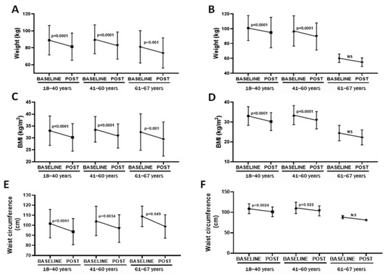 Representation of variation in weight (kg, (A,B)), BMI (kg/m2, (C,D)), and waist circumference (cm, (E,F)), presented as the mean and SD, of the volunteers enrolled in the present study separated initially into women (A,C,E) and men (B,D,F), followed by separation into different ages (from 18 to 40; from 41 to 60; and more than 60 years), both before (BASELINE) and after (POST) 4 Phases Methodology application.