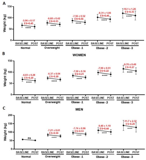 Beyond the evaluation concerning age, we also performed an analysis of weight loss related to BMI (normal, overweight, obese I, obese II, and obese III, Figure 5). In general, there were significant reductions (**** p < 0.0001) in the weight for all BMI classes, with a small or moderate effect size, as shown in Figure 5A (total), Figure 5B (women), and Figure 5C (men). However, it was not possible to verify whether men with a normal BMI lost weight due to decreased number of participants (n = 2).