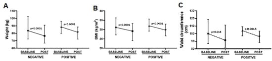 Lastly, we also analyzed the effect of the presence of urinary ketone bodies on the reduction in weight, BMI, and waist circumference (Figure 6). Interestingly, significant reductions in weight (p < 0.0001, −7.95 ± 1.63 kg with ES = 0.30, Figure 6A), BMI (p < 0.0001, −2.98 ± 0.90 BMI with ES = 0.37, Figure 6B), and waist circumference (p = 0.048, −6.87 ± 0.72 cm with ES = 0.33, Figure 6C) were observed post-4 Phases Method application in the volunteer groups that did not present urinary ketone bodies (negative). In a similar way, significant reductions in weight (p < 0.0001, −7.33 ± 0.57 kg with ES = 0.33, Figure 6A), BMI (p < 0.0001, −2.71 ± 0.15 BMI with ES = 0.37, Figure 6B), and waist circumference (p = 0.0015, −7.66 ± 0.67 cm with ES = 0.47, Figure 6C) were observed post-4 Phases Method application in the volunteer groups that presented urinary ketone bodies (positive).