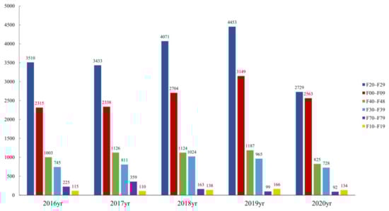 | Schizophrenia, schizotypal and delusional disorders (F20–F29) | 6033 (43.3%) | 5984 (41.0%) | 6979 (42.6%) | 7439 (42.0%) | 2729 (38.1%) |
