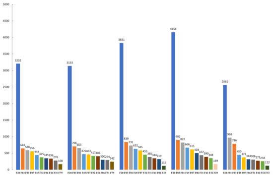 | Organic, including symptomatic, mental disorders (F00–F09) | 3914 (28.1%) | 4192 (28.7%) | 4938 (30.2%) | 5661 (32.0%) | 2563 (35.8%) |