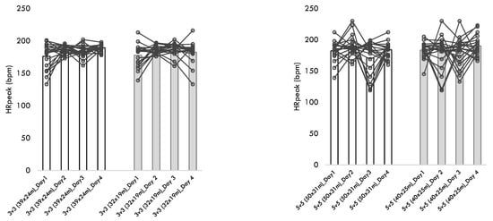 One of the concerns in training prescription is projecting the dose for the players. The act of designing small-sided games is complex since many task constraints can be used in combination and some of them can contribute to changing behaviors that are naturally associated with variation in players’ responses [6]. In our study, we tried to identify how physiological and locomotor players’ responses can vary across four consecutive days for the same games. The within-player variability revealed that heart rate responses are more stable, and the coefficients of variation are, on average, between 6.0 and 11.9% for maximum and mean heart rate. These values are slightly higher than those reported by previous studies on the variability of heart rate responses in the same small-sided games [4,15,23], yet they confirm that physiological responses are relatively reproducible across the days and conditions. The games played no effect on the within-players variability in heart rate mean, although significant differences were found between games on the maximum heart rate. On average, the 3v3 varied between 6.0% and 6.5% of the coefficient of variation, while 5v5 games ranged from 10.3% to 10.4%. The fact that smaller formats of play induce smaller variability can be associated with the time of repetition (3 min) and the fact that, in the 3v3 format, the levels of participation were more equal [24]. Interestingly, this finding may help coaches in the training prescription, since 3v3 induces values closer to those necessary for developing aerobic power [1], and these stable values presented by players across sessions can help coaches to trust in the 3v3 format to induce a similar physiological stimulus while prescribing small-sided games for targeting aerobic power [25].