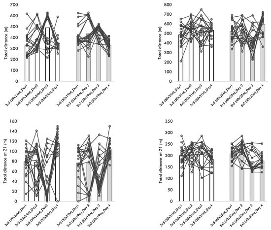 Descriptive statistics of total distance and distance covered at Z1 over the different formats, pitch dimensions, and days.