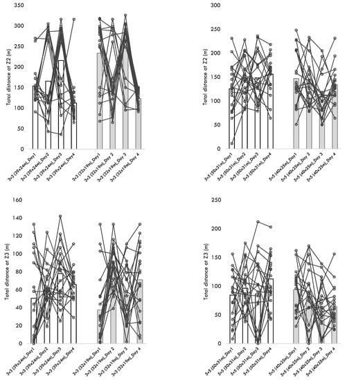 Descriptive statistics of distances covered at Z2 and Z3 over the different formats, pitch dimensions, and days.