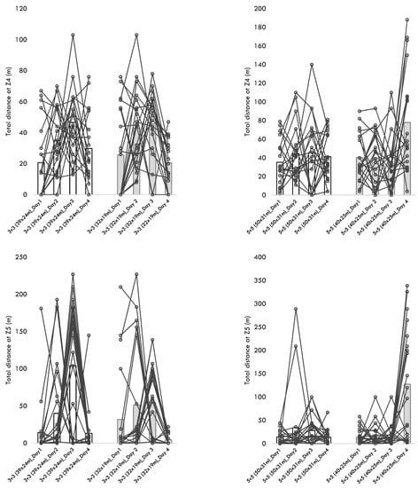 Descriptive statistics of distances covered at Z4 and Z5 over the different formats, pitch dimensions, and days.