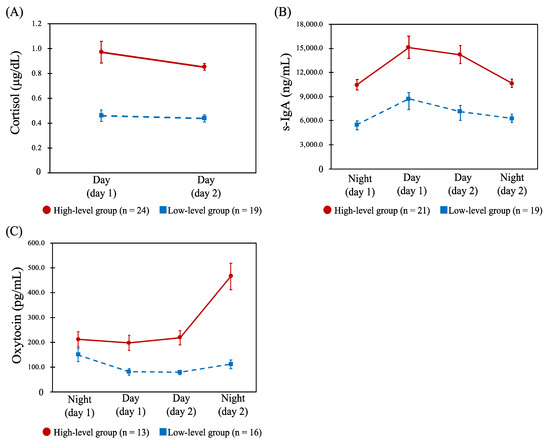 Profiles of the salivary cortisol, secretory immunoglobulin A (s-IgA), and oxytocin. Abbreviations: Day, day shift; Night, night shift; s-IgA, secretory immunoglobulin A. Note: Data are shown as the mean (error bar, standard error of measurement) of each biomarker concentration. (A): Dynamics of the salivary cortisol concentration (μg/dL) between day shifts in the high-level (n = 24) and low-level groups (n = 19). (B): Dynamics of the s-IgA concentration (ng/mL) between the four shifts in the high- (n = 21) and low-level groups (n = 19). (C): Dynamics of the salivary oxytocin concentration (pg/mL) between the four shifts in the high- (n = 13) and low-level groups (n = 16).