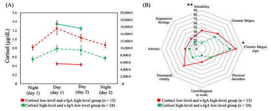 Based on the aforementioned results, HCA was performed by combining cortisol (across the two day shifts) and s-IgA (across four shifts), the two salivary biomarkers with significant differences in terms of the CFSI complaint rates. HCA was performed on the six variables, which were identified and comprised the following: (i) low levels of cortisol in two day shifts and high levels of s-IgA in the four shifts (cortisol low-level and s-IgA high-level group, n = 15) and (ii) high-levels of cortisol and low-levels of s-IgA (cortisol high-level and s-IgA low-level group, n = 24). Figure 3A shows the dynamics of cortisol and s-IgA levels of these two groups. As shown in Figure 3B, the complaint rates of the CFSI were significantly higher in the cortisol low-level and s-IgA high-level group than in the cortisol high-level and s-IgA low-level group in the following categories belonging to the physical or social aspect: chronic fatigue sign (p = 0.041) and irritability (p = 0.004).