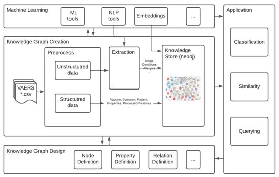 The knowledge graph was designed based on the VAERS data structure and potential use cases from the application. In knowledge graph creation, we preprocess the data, both structured and unstructured, to create knowledge graph nodes, properties and relationships and store them in the neo4j GraphDB. There is a machine learning component to help with the whole process, for example, to extract entities from unstructured data, compute node embeddings and build machine learning models for the application, etc.