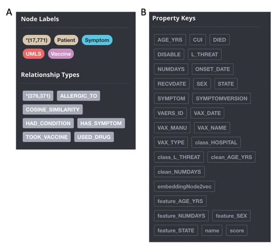 As shown in Figure 2A, four types of node labels are built in the GraphDB (patient, symptom, UMLS and vaccine). Each patient and vaccine is set as an individual node. The reports are extracted, and the information is built into the graph as edges, which includes allergic_to, consine_similarity, had_condition, has_symptom, took_vaccine, used_drug, etc. The property keys are set based on the patient information, vaccination information, hospitalization record, symptoms and treatment information in the dataset. This includes age_yrs, CUI, died, diable, L_threat, numdays, onset_date, recvdate, sex, state for each patient node, symptom and symptomversion for each Symptom node, vaers_id, vax_date, vax_type, vax_manu and vax_name, etc. for each Vaccine node. All the nodes are assigned a name property as the name to be displayed in the neo4j interface. For Patient Nodes, their names are the patient ids, and for Symptom and Vaccine Nodes, their name properties are the same with symptom and vax_name properties (Figure 2B). Moreover, we also kept the labels and features as dynamic properties for machine learning modeling, including binary label class_HOSPITAL, node embedding embeddingNode2vec, and processed features, such as one hot encoded feature_SEX, feature_STATE, etc.