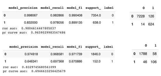 For classification, the performance of prediction of hospitalization of a patient after receipt of a COVID-19 vaccine with certain symptoms was tested. We use cypher to pull the data from the GraphDB and split the data as 80% training set and 20% test set. In the training set, there are 7354 records without hospitalization (label 0) and 638 with hospitalization (label 1). In the test set, there are 1846 records without hospitalization (label 0) and 152 with hospitalization (label 1). Given the small size of the data with imbalanced labels, the final performance of the model is also evaluated with a confusion matrix, f1 score and precision recall AUC.
