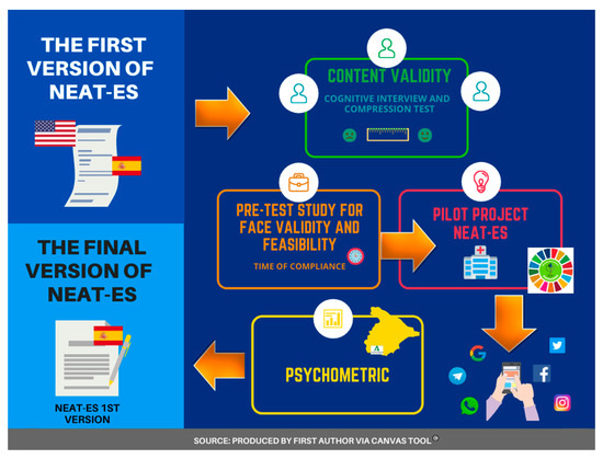 The research design was a qualitative and quantitative mixed method carried out. The qualitative part was carried out using cognitive interview (CI) techniques [35] to validate the content of the construct. In these semi-structured CIs, the participants were measured to ask about the level of understanding, completion, and presentation of the online format. Subsequently, the pre-test, which was included in the NEAT-es questionnaire of the pilot study, was intended to measure the face validity [36]. Three sections were included: a question that asked about the degree of difficulty in completing the questionnaire with a five-point Likert scale, where one = very difficult and five = very easy, one about the time to complete it; and an open question was included for participants to have comments in a text box, which focused on “Would you like to comment any further on the survey?”