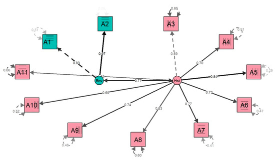 The preliminary descriptive stage indicated that internal consistency was also good, with a higher Cronbach’s alpha (0.90) and the subsection was more relevant. However, the EFA of this preliminary analysis, being standardized that the factor loadings are between -1 and 1, identified values on the limit of 1 point, usually in pattern 2. These results can be explained by the obliquely rotated factorial solution, which indicated the association of two latent factors (patterns 1 and 2) that group all the variables, surpassing the factorial loads [47]. Despite the initial surpassing of the factorial loads, the confirmatory analysis showed factor loads between the standardized limits, confirmed in complementary studies that were represented only once (Figure 2), but also confirmed in all the analyses with the R commander.
