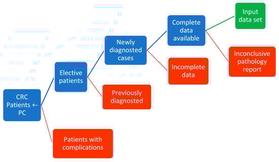 Rigorous inclusion or exclusion criteria were applied to the initial data pool (Figure 1). All patients priorly diagnosed with PC or referrals with a probability of a high PC burden were excluded, as were patients with CRC complications (intestinal obstruction, peritumoral abscess) or any other underlying condition such as concomitant infections that would influence the blood panel. Incomplete data sets were also excluded. The CRC diagnosis was established through a pathology report. Despite suggestive clinical and paraclinical findings, patients with inconclusive pathology results were excluded, as were patients with appendicular mucinous carcinoma due to its rarity and particular pathophysiology. Pathology reports were also excluded from the data sets. While these could have provided additional information that might have improved predictions, the use of reports would have undermined the initial goal of the study; the same reasoning was applied to imaging and tumor markers. Patients included in the study were diagnosed with CRC and PC during their current admittance. In all cases, a PC diagnosis was solely an intraoperative finding, which accorded with the study’s aims. In all cases, the peritoneal burden was low.