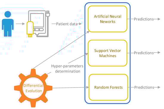 Like all evolutionary algorithms, DE evolves an initial population of solutions using operations such as mutation, crossover, and selection. Then, the process is repeated until a stop criterion is reached. In the current work, the role of DE is to optimize the ANN from a structural point of view (number of layers and neurons in each hidden layer) and to identify the most critical parameters for SVM and RF.