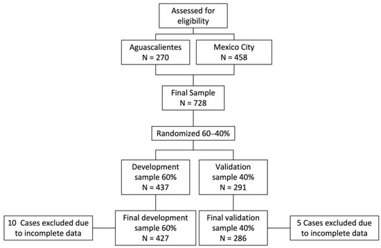 In total, 728 participants were formally enrolled in the study (Figure 1). Those with high-risk pregnancies or any disease that makes breastfeeding impossible were excluded. Due to missing data in the information obtained, 10 participants in the development and 5 in the validation samples were eliminated. The remaining 713 women were considered in the study. All volunteers gave written informed consent before being enrolled in the study.