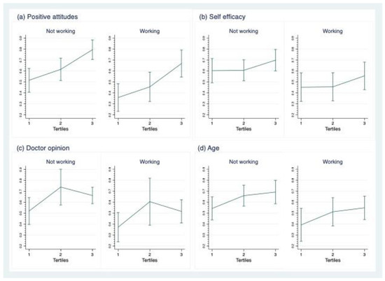 We observed no interaction between the model variables; the marginal effects were not statistically significant by employment status or between the tertiles of the scales, except for the attitude scale only for women who do not work.