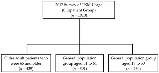 The data compared and analyzed in this study were from a subset of the 1010 outpatients in the 2017 National Survey for Usage and Consumption of Traditional Korean Medicine. For our study, we excluded 301 patients who were 51–64 years old and only included 439 older patients (65 years or older) along with 301 patients who were 51–64 and 270 patients who were 19–50 years old, amounting to 709 participants in total. In this study, the older group (65 years and older) was compared with the young adult group (19–50 years) and the adult group (51–64 years). The selection process of the participants is shown in Figure 1.