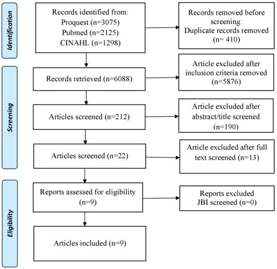 The number of articles obtained from the search was 6498. After removing duplicate articles, we had 6088 articles. Furthermore, after elimination based on the inclusion criteria, there were 212 articles left. Then, after checking the title and abstract, 22 articles were found. Then, the author conducted an overall full-text analysis of the article and found nine articles to analyze.