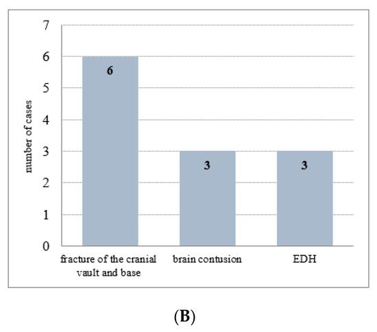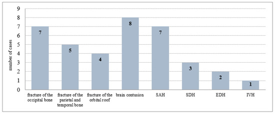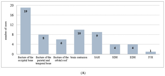 A total of 308 cases were included in this group (60.4% of the final set). The most common cause of death was brain death. There were 225 cases of injuries with skull fractures (210 fractures of the skull and/or base, 15 fractures of the facial bones). There were 122 cases of fractures of the cranial vault and the base, in 56 cases only a fracture of the cranial base, and in 32 cases only a fracture of the cranial vault. Skull fractures were combined in 94.8% of cases with extracerebral post-traumatic hemorrhage (subdural, subarachnoid, and epidural) and 85.4% with brain contusion. Intraventricular hemorrhage was detected in 43 cases (20.5%). Facial bone fractures were combined with brain contusion (66.7%) and subdural hemorrhage (33.3%). There were 83 cases of injuries without skull fractures. The most common cases were subdural hemorrhage (48 cases), brain contusion (21), subarachnoid hemorrhage (11), and epidural hemorrhage (3 cases). In all cases, only a CT scan of the head was performed.
