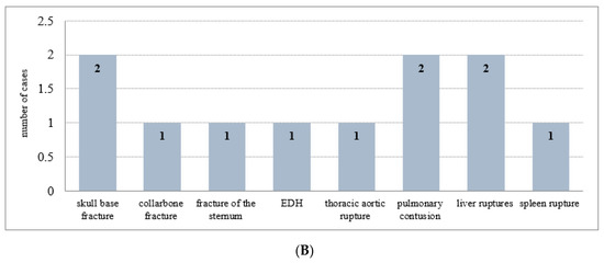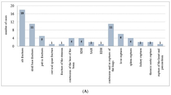 30]. Our study shows that CT examination revealed fewer rib fractures than autopsy, especially fractures of the anterior rib sections. In one case, we confirmed that a thoracic aortic rupture diagnosed by CT examination was not confirmed at autopsy; autopsy revealed a rupture of the atrium of the heart. Another study evaluating 20 cases of fatal falls from a height confirmed our findings that falls from a height most often result in chest injuries, especially in the case of rib fractures. Cranial fractures were identified in this study only as the second-most common form of fracture [