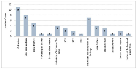The most frequent CT-undescribed, but autopsy-confirmed injuries were fractures (36 cases). The most common were rib fractures (18), then skull base fractures (11), pelvic fractures (5 cases of sacroiliac joint injury), fracture of the sternum (1), and cervical spine fracture (1 case; CT did not reveal a lesion of the atlanto-occipital junction). There were also 11 cases of CT-undescribed intracranial injuries—contusions of the base of the brain (4), subdural hemorrhage (4), subarachnoid hemorrhage (2), and epidural hemorrhage (1). Of internal organ injuries found at autopsy, CT did not describe contusions and/or ruptures of the lungs (11), liver ruptures (6), spleen ruptures (4), kidney ruptures (2), thoracic aortic rupture (2), nor rupture of the heart and pericardium (1). False negative cases of CT scans for each type of injury are summarized in