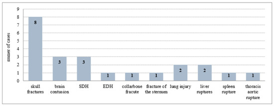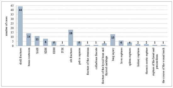 The final set was divided into groups and the external cause of death (death mechanism) was determined as a basic criterion. At the same time, it was taken into account which body areas were traumatically damaged and whether it was an isolated injury to one or more regions of the body. Accordingly, the set of 510 deaths was divided into the following groups: isolated blunt head injuries (308 cases), transport accidents (133 cases), falls from a height (42 cases), gunshot wounds to the head (11 cases), hangings (10 cases), and sharp object injuries (6 cases).