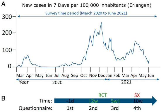 (A) The number of new cases in seven days per 100,000 inhabitants in Erlangen from March 2020 to June 2021. (B) The timeline corresponds to the period in which the patient received the questionnaire and in which therapy stage the patient was at (RCT = radiochemotherapy; SX = surgery).