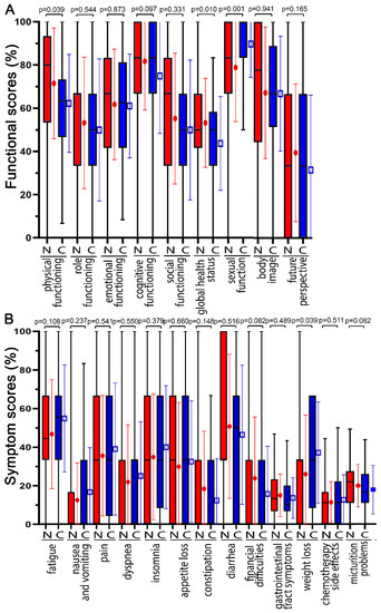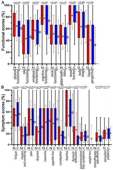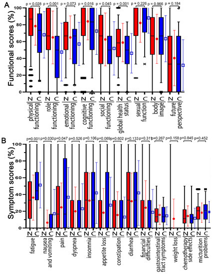 The functional and symptom score distribution of prior to the COVID-19 pandemic (N = non COVID) compared with during the COVID-19 pandemic (C = during COVID pandemic). Baseline values were surveyed on day 1 before radiochemotherapy. (A) Functional scores are: physical functioning, role functioning, emotional functioning, cognitive functioning, social functioning, global health status, sexual function, body image, and future perspective. (B) Symptom scores are: fatigue, nausea and vomiting, pain, dyspnea, insomnia, appetite loss, constipation, diarrhea, financial difficulties, gastrointestinal tract symptoms, weight loss (WL), chemotherapy side effects, and micturition problems. The different symbols signify the outliers and extreme values. □ and ● indicate the mean and error bars the standard deviation.
