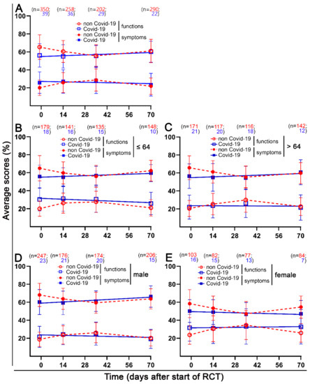 Time course of different functional and symptom scores, the functional and symptom scores for the two age groups (age <64 and age >64), and two sexes (male and female) at day 1, day 14, day 35, and day 70 at pre-pandemic times and pandemic times. (A) The general functions and symptoms for both the pre-pandemic and pandemic periods. (B) The young age cohort ≤ 64 years compared to the older age cohort (C) >64 years before the pandemic and in the pandemic period. (D) Males compared to (E) females before the pandemic and in the pandemic period. Error bars indicate the standard deviation.