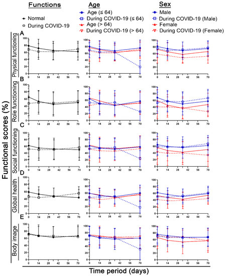 Time course of different functional scores at day 1, day 14, day 35, and day 70. In the first column, the entire cohort is separated into normal (before COVID-19) and during COVID-19. In the second column, the cohort was divided into patients younger or 64 to older than 64. In the third column, females and males of the cohort were compared for (A) physical function, (B) role function, (C) social function, (D) global health status, and (E) body image. Error bars indicate the standard deviation.